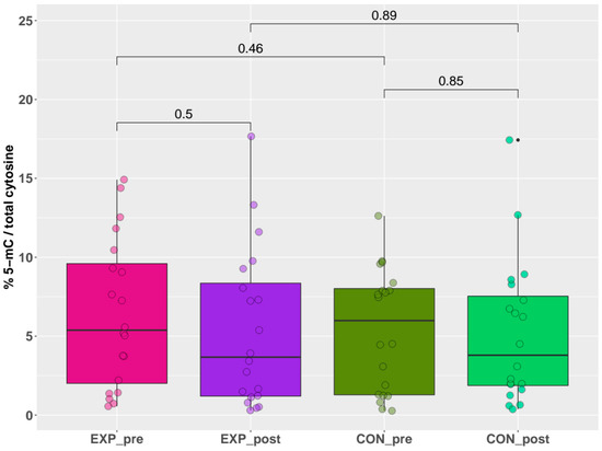 Pre-shift and post-shift levels of % 5-mC in exposed and control groups.