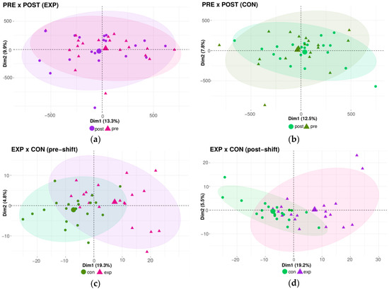 The impact of the nanoparticle exposure on the DNA methylation pattern; analyzed by PCA. (a) Comparison between exposed pre-shift and exposed post-shift groups. (b) Comparison between control pre-shift and control post-shift groups. (c) Comparison between exposed pre-shift and control pre-shift groups. (d) Comparison between exposed post-shift and control post-shift groups.