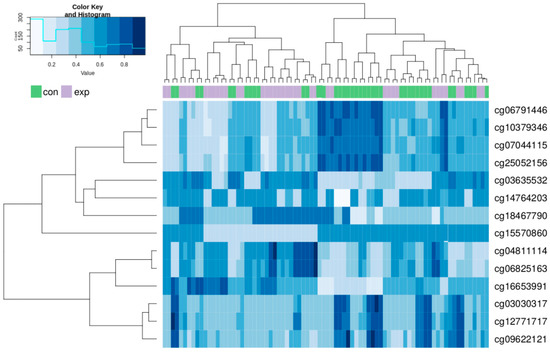 A hierarchical clustering analysis was done for all of the above-described 705 CpG loci in both groups. The results showed a trend to separation of the exposed and control group. These synoptic results are presented in Appendix A as Figure A1. After restriction of the clustering analysis to the results with log fold change (FC) > 1.5 and log FC < −1.5, we obtained the 14 most significant results (8 hypomethylated and 6 hypermethylated). The results of the new hierarchical clustering analysis including individual cg numbers of individual CpG loci for all participants of both the exposed and control group showed more details (data presented in Figure 4).