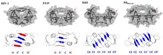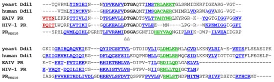 Data about PRPEG10 are limited, therefore in silico methods were applied to investigate its structural characteristics. Results of secondary structure prediction implied that the conserved active-site motif and the overall secondary structure element arrangement of PRPEG10 are shared with retroviral PRs (Figure 1). Disorder prediction revealed that the region in close proximity to the frameshift site (247–348) is unstructured. A region located near the catalytic D-S-G-A motif was predicted to adopt an α-helical conformation (Figure 1). This helical region presumably corresponds to an additional helical insert that is not present in most retroviral PRs but is present in equine infectious anemia virus (EIAV) protease [], as well as in both human and yeast DNA-damage-inducible 1 (Ddi1) proteins []. The C-terminal region of the protease domain was predicted to contain three β-sheets connected by short loops (Figure 1), implying that the homodimeric PRPEG10 has a six-stranded dimer interface.