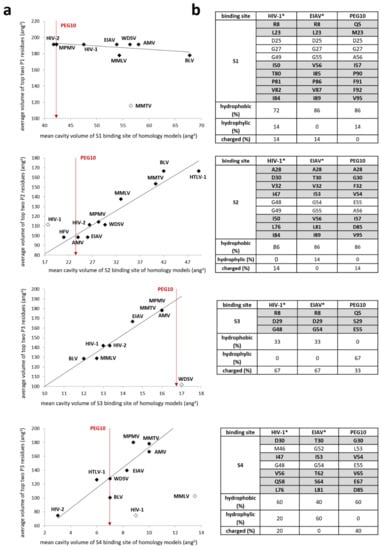 Comparison of mean cavity volumes and substrate binding site compositions. Mean cavity volumes (left graphs) and amino acid compositions (right tables) of substrate binding sites are shown for HIV-1, EIAV, and PEG10 proteases. Graphs represent the average volumes of most preferred residues plotted against the mean cavity volumes of the substrate binding sites. The most preferred residues and cavity volumes have been determined previously for retroviral proteases in vitro and in silico, respectively [,]. Black diamond symbols indicate values used for correlation analysis, while opened diamonds show values that have been excluded from the correlation. Only mean cavity volumes are indicated for PRPEG10 binding sites (shown by red arrows), since the volumes of preferred residues have not been determined experimentally to date (a). Substrate binding site compositions of HIV-1 and EIAV PRs (*) were determined in previous studies [,] and structural alignment based on homology model structure was used to identify residues in the case of PRPEG10. Bold letters indicate that side-chain–side-chain interaction may occur. Residues were classified as follows: hydrophobic: A, V, I, L, F, W, C, M, P, and G; hydrophilic: S, T, N, Q, Y, and H; charged: D, E, K, and R (b).