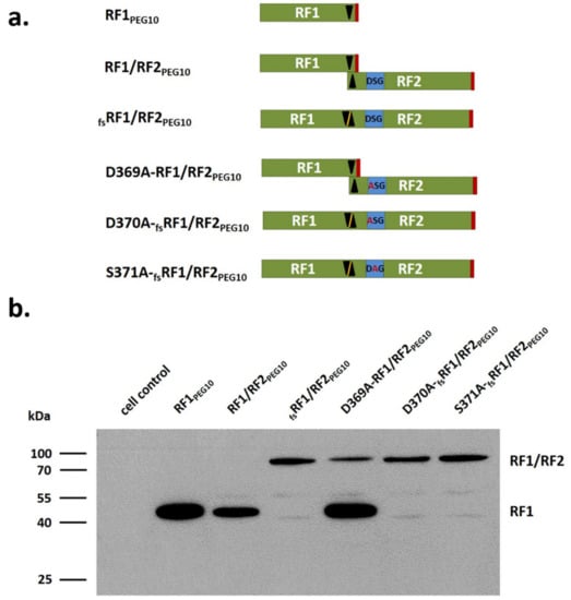 Comparison of the studied forms of PEG10. Schematic structures of the PEG10 proteins designed in the present study. RF1 and RF2 are colored by green, the black triangles indicate the frameshift site, and red markings show the termination codons of the translation, while blue color highlights active site motif (a). Expression of different forms of RF1/RF2PEG10 in HEK293T cells was detected with anti-PEG10 antibody (b).