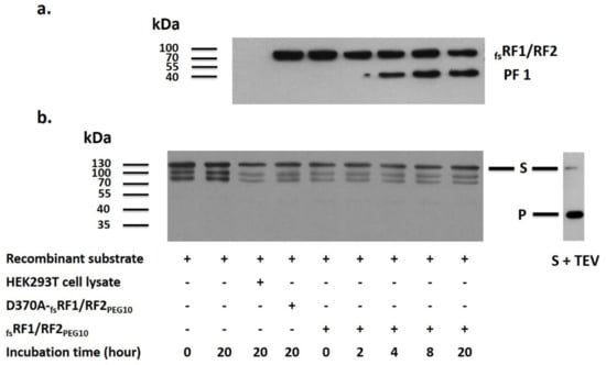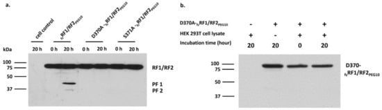 In addition, we suppose that the ~8 kDa difference observed between the molecular weights of the PF1 and PF2 product bands (Figure 5a) may be the result of ubiquitination; accordingly, the ~45 kDa cleavage fragment may correspond the ubiquitinated form of the ~37 kDa product. The ~37 kDa product containing the intact N-terminal region of RF1 had relatively lower band intensity compared to the other band (~45 kDa), both in the previous report [] and the herein described blot image. To prove this, the eukaryotic expression system needs to be applied for protein expression, because Escherichia coli cells lack an ubiquitination system. Moreover, proteolytic fragments may be hardly detectable in total cell lysates, where a significant amount of ubiquitinated cellular protein may also be detected.