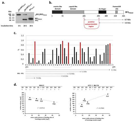 Estimation of the autoproteolytic region in fsRF1/RF2PEG10. To identify the region in fsRF1/RF2PEG10 where the autoproteolysis may occur, the molecular weight of PF1 was compared to that of RF1PEG10. A representative blot image of three independent experiments is shown (a). Approximately 4–5 kDa difference in the molecular weight indicated that RF1PEG10 may be cleaved prior to the frameshift site, between the C-terminal capsid-like domain and the Zn-finger motif (b). The sequence of RF1PEG10 was analyzed in order to identify a potential cleavage site in the region between the capsid-like domain and the Zn-finger motif. The volumes of P4–P1 residues were correlated with the calculated cavity volumes of S4–S1 sites, respectively (see cavity volumes in Figure 3). Each arrow shows a putative cleavage position for which a correlation coefficient (r2) has been determined. The highest values are shown in red. The calculated difference between RF1PEG10 and PF1 is also shown for some cleavage positions. The dashed line shows the sequence for which the correlation analysis is shown in the graph (c). For PEG10, the graph shows the correlation between volumes of P4–P1 residues and S4–S1 cavities for the 266HQVD*PTEP273 cleavage site. For comparison, calculation was performed for the HIV-1 MA/CA cleavage site (SQNY*PIVQ) using the cavity volumes published previously (d) [,].