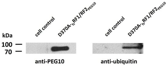 Ubiquitination of D370A-fsRF1/RF2PEG10 was detected by Western blot using anti-ubiquitin antibody (Figure 7), proving that the protein undergoes ubiquitination. The molecular weight of the protein was estimated in relation to molecular weight markers after SDS-PAGE, and the obtained difference implied di-ubiquitination of the protein (the molecular weight of ubiquitin is ~8.5 kDa).