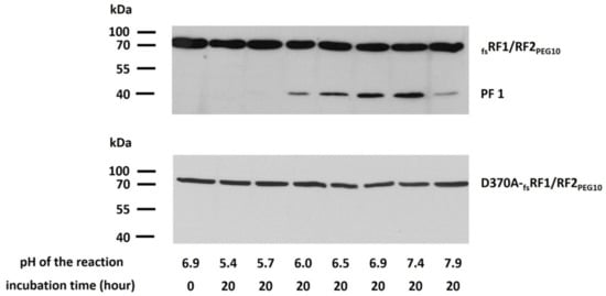 The dependence of fsRF1/RF2PEG10 autoproteolytic activity on pH was also studied in the pH range of 5–8 (Figure 9). The appearance of the PF1 proteolytic cleavage product was followed by detection of fsRF1/RF2PEG10 using Western blot. We observed increasing band intensities at ≥ 6.0 pH, while lower pH was found to be suboptimal for PRPEG10. The optimal pH for the autoprocessing of fsRF1/RF2PEG10 was close to neutral (between 6.9 and 7.4) (Figure 9a). The D370A mutant fsRF1/RF2PEG10 was used as control, and as expected, it exhibited no autoproteolytic activity (Figure 9b).