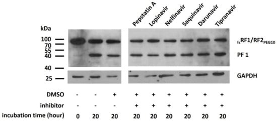 Using in vitro experiments, we assessed whether pepstatin A, lopinavir, nelfinavir, saquinavir, darunavir, and tipranavir PR inhibitors are able to inhibit PRPEG10 self-processing. The control sample contained only DMSO, since the inhibitors were dissolved in this organic solvent. None of the tested inhibitors showed significant inhibition of the protease activity; the formation of PF1 product was comparable to that in the control sample (Figure 10).
