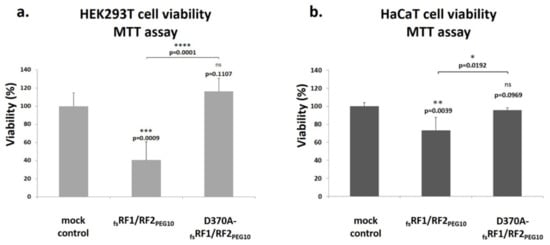 fsRF1/RF2PEG10 decreases the viability of HEK293T and HaCaT cells. The role of PRPEG10 in the cell viability of HEK293T (a) and HaCaT cells (b) was investigated using the MTT assay, which was performed 1 day after transfection. Mock control cells were transfected with pQE-TriSystem plasmid. Significance values were determined as compared to mock control, otherwise they are indicated. Note: ****p ≤ 0.0001; ***p ≤ 0.001; **p ≤ 0.01; *p ≤ 0.05; ns = non-significant (p > 0.05). Error bars represent SD (n ≥ 4).