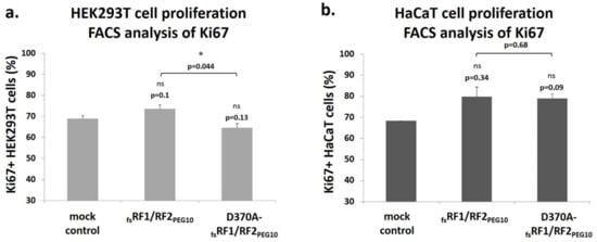 HEK293T and HaCaT cells maintained in DMEM (supplemented with 1% penicillin-streptomycin, 1% glutamine, and 10% FBS) were plated in 6-well plates at a density of 3 × 105 cells/well 24 h before transfection. Cells maintained in Opti-MEM medium lacking antibiotics were transfected with fsRF1/RF2PEG10 or D370A-fsRF1/RF2PEG10 DNA, using Lipofectamine LTX&PLUS™ reagent (Invitrogen, CA, USA) according to the manufacturer’s protocol. Then, 5 μL/well Lipofectamine reagent and 3 μg/well plasmid DNA were diluted in Opti-MEM medium and incubated for 5 min. After incubation, the DNA and the Lipofectamine were mixed (volume ratio of 1:1). In order to form the DNA-lipid complex, the solution was incubated again for 20 min. The incubated solution was added to the cells in 750 μL Opti-MEM dropwise and incubated for 5 h. For mock control, pQE-TriSystem was used to transfect cells. After incubation, 3 mL of fresh medium supplemented with 10% FBS was added to the transfected cells, which were then further incubated for 36 h. The success of transfection was verified by determining the fluorescence of control cells that had been transfected with pQE-TriSystem-GFP plasmid. Cellular proliferation was analyzed using flow cytometry (FACS Calibur, BD Biosciences, San Jose, CA, USA), using mouse-anti-human Ki67-FITC antibody (11-5699-41, eBioscience, San Diego, CA, USA).