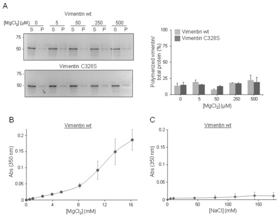 Effect of MgCl2 or NaCl on vimentin polymerization. (A) Vimentin wt or C328S in 5 mM PIPES-Na pH 7.0, 0.2 mM DTT, was incubated with the indicated concentrations of MgCl2 for 1 h at r.t., and polymerization was assessed by ultracentrifugation as above. Supernatant (S) and pellet (P) fractions, containing soluble and polymerized vimentin, respectively, were analyzed by SDS-PAGE and staining with Sypro-Ruby. The percentage of polymerized vimentin for every condition is shown in the graph as average values ± SEM from two assays. (B,C) Vimentin wt was incubated with increasing concentrations of MgCl2 (B) or NaCl (C) and turbidity measured at 350 nm at r.t. Results are the mean ± SD of three (B) or two (C) assays.