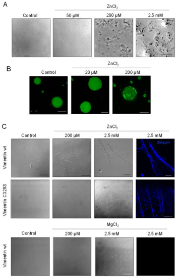 Turbidity assays provide a quantitative measurement of vimentin oligomerization. However, they do not provide information on the morphology of the assemblies formed. Therefore, we employed several microscopy techniques to assess this point (Figure 4). When a solution of vimentin was incubated with increasing concentrations of ZnCl2 in a flat-bottomed plastic microplate, vimentin formed assemblies with a garland-like appearance that were detectable after 10 to 20 min of incubation with 200 µM ZnCl2 and became more abundant with higher zinc concentrations (Figure 4A).