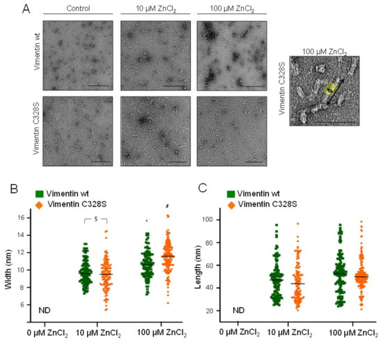 Observation of zinc-induced vimentin structures by electron microscopy. (A) Vimentin wt or C328S was incubated with the indicated concentrations of ZnCl2 for 1 h at r.t., fixed, negatively stained, and inspected by EM. Scale bars, 200 nm and 100 nm for the right panel. The width and length of the observed fibrils were measured using FIJI software as illustrated in the right panel, and results are summarized in the graphs. (B) Width of the structures of at least 20 nm in length. (C) Length of the structures observed. Results shown are the mean values ± SEM of 50 “structures” per condition. § p < 0.05 vimentin wt vs. C328S, as indicated; * p < 0.05 vs. vimentin wt with 10 µM ZnCl2; # p < 0.05 vs. vimentin C328S with 10 µM ZnCl2 by the unpaired Student’s t-test.