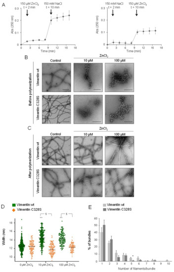 In contrast, when NaCl-induced preformed vimentin filaments were incubated in the presence of zinc, filament integrity was not altered (Figure 6C). Nevertheless, a clear increase in filament width, from 12.6 to 14.3 nm, was observed with the lowest ZnCl2 concentration assayed (10 µM). Higher concentrations of ZnCl2, up to 100 µM, did not induce further increases in filament diameter (Figure 6C). Importantly, this effect was observed only in vimentin wt filaments, since vimentin C328S filaments remained unaltered in the presence of zinc (quantitated in Figure 6D). Moreover, 100 µM ZnCl2 affected preformed filaments by inducing lateral association, preferentially in vimentin wt. Thus, in vimentin wt, bundles contained more filaments on average (3.4 ± 1.8 in wt vs. 2.8 ± 1.4 in C328S vimentin, average ± SD of over 200 bundles, p < 0.0001). Moreover, vimentin wt bundles were tightly packed, with a poor definition of individual filaments. In contrast, vimentin C328S filaments exposed to 100 µM ZnCl2 most frequently associated laterally in groups of two or three filaments that preserved their individual contours (Figure 6C). The distribution of filaments in bundles in vimentin wt and C328S is represented in Figure 6E, showing that vimentin wt appears more frequently than vimentin C328S in groups of three or more filaments, whereas the mutant appears more frequently than the wt in groups of one or two filaments.