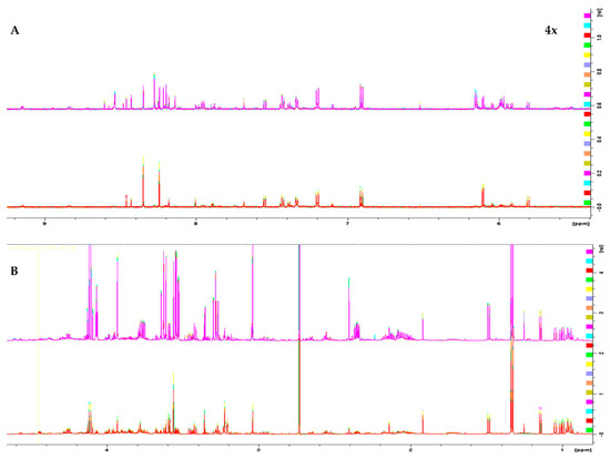 1H 1D NMR spectra of: (A) the aromatic region and (B) the aliphatic region of the WM2664 metastatic (n = 10, top) and WM115 pre-metastatic cell group (n = 10, bottom). The metastatic group exhibits notable upregulation of most metabolites. Aromatic region was magnified (4×) compared to the aliphatic one, in order to aid visual inspection.