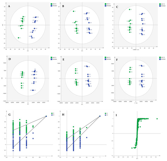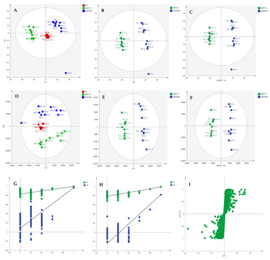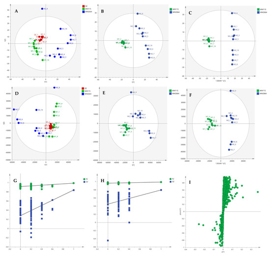 (A) PCA, (B) PLS-DA and (C) OPLS-DA scores plots in UV scaling, and (D–F) the corresponding scores plots in Pareto scaling of MS data, in positive ion mode. Permutation tests of PLS-DA models (G) in UV και (H) in Pareto scaling. (I) S-plot from OPLS-DA model.