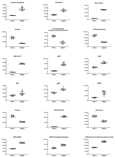 The Venn diagram of Figure 6 summarizes the metabolites that were found to be important for separation of the two cell lines, WM115 and WM2664, by multivariate (S-plot, VIPs) and univariate statistical analysis (Volcano plot). Metabolites that emerged from both statistical approaches are presented at the intersection of both sets, and, thus, may serve as mechanistic biomarkers, with strong prognostic, diagnostic and therapeutic potential, for human advanced melanoma undergoing metastasis.