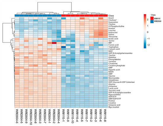 1H 1D NMR spectra of the two melanoma cell lines, WM115 and WM2664, are shown in Figure 1. The Chenomx NMR Suite v. 8.4 and the HMDB online library were used for identification of the extracted metabolites via NMR spectroscopy [16]. The human melanoma-derived metabolites are described in Table S1, while a representative WM2664 annotated spectrum is given in Figure S2. A total of 50 metabolites were identified across all samples, with 39 of them being recognized to significantly differ between the two melanoma cell lines in the statistical tests.