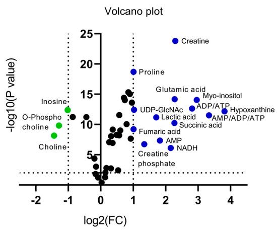 An alternative visualization of the statistical results of “omics” data is the Volcano plot, which allows the identification of metabolites that exhibit the strongest combination of Fold Change (FC) (x) and statistical significance (p value). The Volcano diagram is two-dimensional, with the x-axis representing the variation ratio of each metabolite (log2FC) and the y-axis the p value obtained from the corresponding statistical test t (-log10P) [17,18] (Table 2). Metabolites with the most significant contribution to the separation of the two melanoma cell lines, WM115 and WM2664, are highlighted in color, with those in the left segment being elevated in WM115 (green) and those being identified in the right segment presenting an increase in WM2664 (blue) (Figure 5).