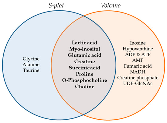 Venn diagram of melanoma metabolites that are related to metastasis. Important metabolites are highlighted (bold fonts) at the interphase of S-plot and Volcano plot.