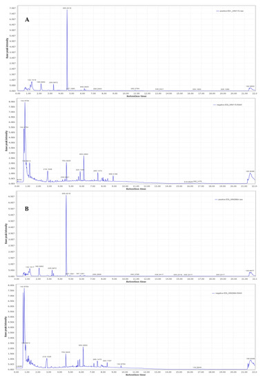 Typical base peak intensity chromatograms of: (A) WM115 and (B) WM2664 melanoma cells, for positive (upper panels) and negative (bottom panels) ion mode.