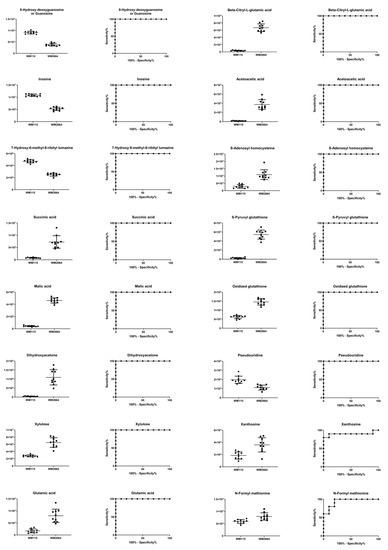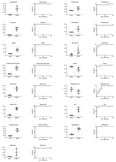 Boxplots and ROC curves, for the most significant metabolites recognized from MS data, are shown in Figure 10 (negative ionization) and Figure 11 (positive ionization).