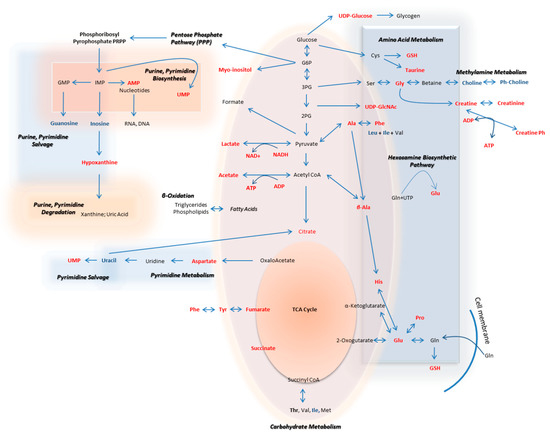 Flow-diagram showing pathways and cognate metabolites critically involved in the discrimination of primary and metastatic human melanoma cells. Blue: reduced levels (Fold Change < 0.50); Red: increased levels (Fold Change > 2). The metastatic cell group is presented with elevated contents of hypoxanthine, myo-inositol, AXP (X: D, or T), UDPs, amino acids and organic acids, and decreased levels of guanosine, inosine and cholines, thus indicating the perturbed purine, pyrimidine and amino acid metabolism during metastasis in melanoma.