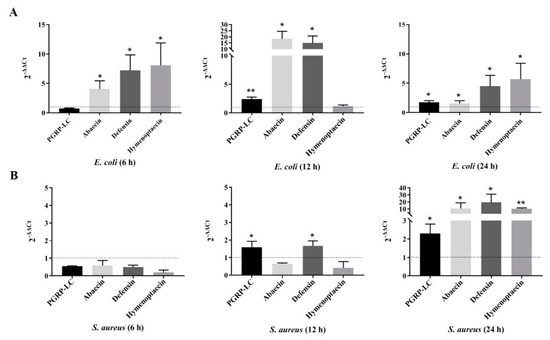 The present study showed that both the Gram-positive bacterium Staphylococcus aureus and the Gram-negative bacterium Escherichia coli can trigger the upregulation of PGRP-LC and the antimicrobial peptides abaecin, defensin and hymenoptaecin (Figure 1). However, over time, the degree of response differs between S. aureus and E. coli. After E. coli infection, the PGRP-LC gene showed no change within 6 h, while hymenoptaecin was significantly upregulated (Figure 1A). After 12 h, the PGRP-LC, abaecin and defensin genes were strongly upregulated (Figure 1A). However, after 24 h, an obvious decrease in the degree of upregulation of the PGRP-LC, abaecin and defensin genes was observed compared to that at 12 h of infection; in contrast, hymenoptaecin was upregulated, which was similar to the result at 6 h of infection (Figure 1A). In contrast to the E. coli infection, the S. aureus infection only caused the upregulation of PGRP-LC and defensin after 12 h and none of the four genes were upregulated within 6 h (Figure 1B). After 24 h, all four genes were upregulated significantly, and the upregulation was obviously higher than that at 12 h of infection (Figure 1B).
