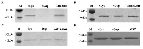 Analysis of the peptidoglycan (PGN)-binding ability of the wild-type bumblebee Bombus lantschouensis PGRP-LC (Bl-PGRP-LC) and honeybee Apis mellifera PGRP-LC (Am-PGRP-LC). Each sample includes four lanes. The first lane (M) is the marker; the second lane (+Lys) shows the corresponding protein samples after pull-down with the meso-diaminopimelic acid (Dap-type) PGN from B. subtilis; the third lane (+Dap) shows the corresponding protein samples after pull-down with the L-lysine type (Lys-type) PGN from M. luteus; and the fourth lane shows the normal corresponding protein as a control. (A) Analysis of the PGN-binding ability of the wild-type Bl-PGRP-LC. (B) The analysis of the PGN-binding ability of the wild-type Dm-PGRP-LC. (C) Analysis of the PGN-binding ability of the wild-type Am-PGRP-LC. (D) Analysis of the PGN-binding ability of the GST-tagged protein.