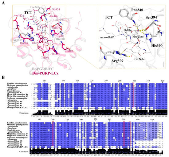 Analysis of the bumblebee Bl-PGRP-LC structure and the sequence alignment of PGRP-LC from bees. (A) Comparison of the Bl-PGRP-LC/TCT complex and the Dm-PGRP-LCx/TCT complex, colored in gray and magenta, respectively. TCT is shown as a line and the contact residues are shown as sticks. The yellow dashed line indicates the bonds between the TCT and the contact residues in the Bl-PGRP-LC/TCT structure. (B) Amino acid sequence alignment of PGRP-LC from different bee species (Melipona quadrifasciata GenBank No. KOX71517.1, Apis dorsata GenBank No. XP_006618726.1, Apis florea GenBank No. XP_003693124.1, Osmia bicornis GenBank No. XP_029039739.1, Apis mellifera X3 GenBank No. XP_006565566.1, Megachile rotundata X4 GenBank No. XP_003702406.2, Megachile rotundata X3 GenBank No. XP_012138567.1, Dufourea novaeangliae GenBank No. KZC08445.1, Apis cerana GenBank No. XP_AGM19450.1, Apis mellifera X5 GenBank No. XP_006565568.1, Apis mellifera X4 GenBank No. XP_006565567.1, Apis mellifera X3 GenBank No. XP_392452.2 and Drosophila PGRP-LCx GenBank No. 2f2l_X). The residues of Bl-PGRP-LC contributing to the TCT binding are boxed with red rectangles.