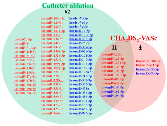 Circulating miRNAs whose plasma levels were correlated with CHA2DS2-VASc score and/or CA. miRNAs whose plasma levels showed positive (red letters) or negative (blue letters) correlation with CHA2DS2-VASc score (q < 0.1) are presented in the red circle. miRNAs whose plasma levels showed positive (blue letters) or negative (red letters) correlation with CA operation (q < 0.1) are presented in the green circle. Underlined miRNAs are reported to be cardiac-enriched miRNAs [21].