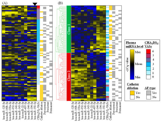 Plasma levels of miRNAs which were correlated with both CHA2DS2-VASc score and CA. Plasma levels (i.e., −∆Cq values) of 11 miRNAs, whose plasma levels showed correlations with both CHA2DS2-VASc score and CA operation, are presented as heat maps. (A) The data was sorted with CHA2DS2-VASc score; (B) Plasma levels of the 11 miRNAs were subjected to hierarchical clustering. Based on the circulating miRNA profile, Class 1 and Class 2 patients are supposed to be associated with low and high stroke risks, respectively. The number of AF patients with paroxysmal-, persistent- and permanent-type were 48, 13 and 22, respectively, and 32 patients received CA operation during the study period. Note that plasma levels of the miRNA are high when their −∆Cq is high. Yellow, black and blue colors represent high, middle and low expression levels of miRNAs, respectively. Red, blue and white colors represent high, middle and low CHA2DS2-VASc scores, respectively.