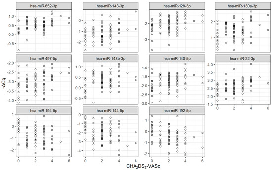 miRNAs associated with both CHA2DS2-VASc score and CA. Plasma levels (i.e., −∆Cq values) of 11 miRNAs, whose plasma levels showed correlations with both CHA2DS2-VASc score and CA operation, are presented as dot plots. X and Y axis represent plasma level (−∆Cq value) and CHA2DS2-VASc score, respectively. Note that plasma levels of the miRNA are high when their −∆Cq is high.