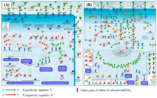 Representative pathways enriched with possible target genes of eight miRNAs whose plasma levels showed positive and negative correlations with CHA2DS2-VASc score and CA, respectively. (A) Pathway maps for “Development_Regulation of epithelial-to-mesenchymal transition (EMT)” and (B) “Pathway maps for “Androgen receptor activation and downstream signaling in Prostate cancer”, the 1st and 2nd most enriched pathways, respectively, querying possible target genes of the miRNA whose plasma levels showed positive correlations with CHA2DS2-VASc score (Table 3). Red bar represents possible target genes of miRNAs whose plasma levels were positively and negatively correlated with CHA2DS2-VASc score and CA, respectively. Green and red arrows mean positive and negative regulation of the target genes, respectively.