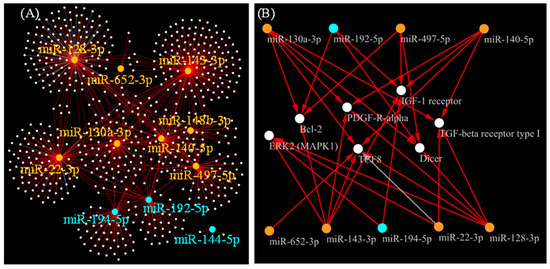 Network model representing miRNA-target gene relationship. (A) Network model representing miRNA-target gene interactions is presented, focusing on 11 miRNAs whose plasma levels showed correlations with both CHA2DS2-VASc score and CA operation, by referring to Metabase knowledgebase. White dots represent possible target genes. Orange and cyan dots represent miRNAs whose plasma levels showed positive and negative correlation with CHA2DS2-VASc score, respectively. Supporting literature information for the miRNA-target gene relationships is provided in Figure S1, and the network model file is provided as Figure S2; (B) Possible target genes that have ≥4 edges connected to either of the selected 11 miRNAs are presented. Orange and blue nodes indicate miRNAs whose plasma levels showed positive and negative correlations to CHA2DS2-VASc scores, respectively. Red and gray edges represent negative and unknown regulations of the miRNAs on their target genes, respectively.