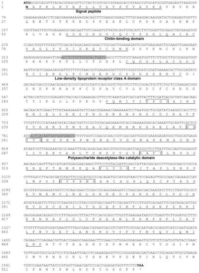 Supplementary materials can be found at https://www.mdpi.com/1422-0067/21/7/2449/s1, Table S1: Details of chitin deacetylase sequences used for phylogenetic analysis, Table S2: Primers used in this study.