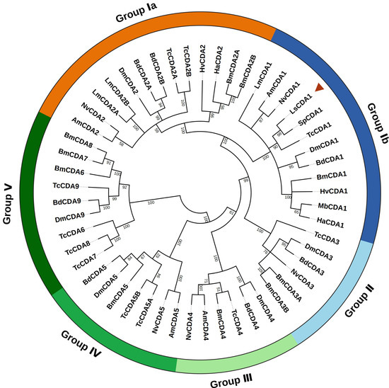 Sequence alignment showed that LsCDA1 shared 96.5%, 93.4%, 91.3%, and 88.5% identity with the CDA1 of S. paniceum (AYA83838.1), T. castaneum (NP_001095946.1), L. migratoria (ANA57443.1), and Ostrinia furnacalis (AKJ26157.1), respectively. Phylogenetic analysis was performed to display the relationships among these insect CDAs. The tree showed that these proteins were divided into five major groups (I–V); LsCDA1 was most closely related to SpCDA1 of S. paniceum and belonged to group Ib CDAs (Figure 2).