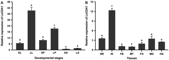 2.2. Developmental and Tissue-Specific Expression of LsCDA1