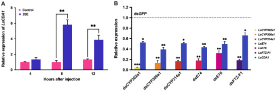 To test whether LsCDA1 is induced by 20E, the fourth-instar larvae were injected with 20E for 4, 8 and 12 h. The expression of LsCDA1 in the 20E treatment group was significantly increased, and the ratios of inducible expression were 5.8- and 3.9-fold at 8 and 12 h post-injection, respectively, compared to the control group (Figure 4a). To further validate the regulation of LsCDA1 in response to 20E signaling, we individually silenced genes encoding ecdysteroidogenesis enzymes (CYP302a1, CYP306a1, and CYP314a1) and 20E signaling components (E74, E78, and FTZ-F1) by the injection of dsRNAs. The mRNA level of LsCDA1 was significantly decreased in the CYP302a1, CYP306a1, and CYP314a1 RNAi larvae compared to that in controls. We also found that the inhibition of the 20E signal in the E74, E78, and FTZ-F1 RNAi larvae significantly downregulated the expression of LsCDA1 (Figure 4b).
