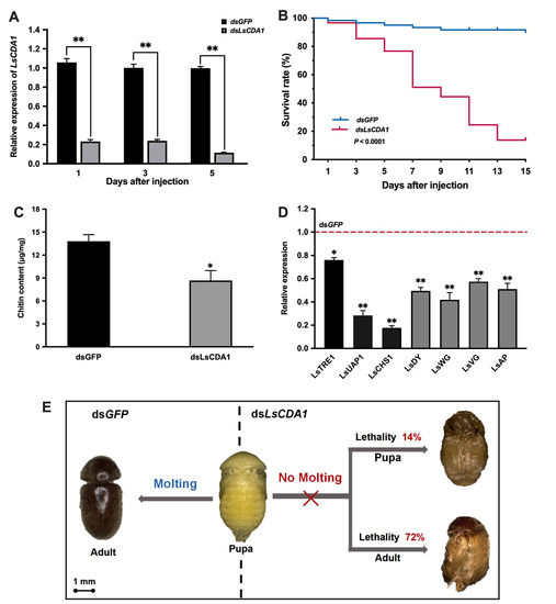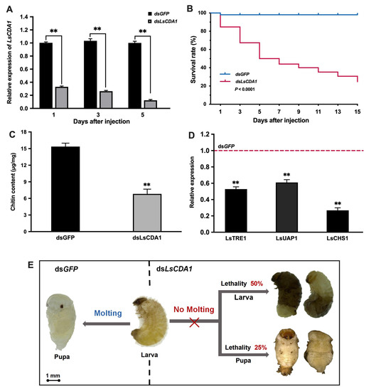 The effect of LsCDA1 knockdown on larval–pupal molting in L. serricorne. (A) The relative expression levels of LsCDA1 at 1, 3, and 5 days after LsCDA1 or GFP dsRNA injection in the fifth-instar larvae. (B) Kaplan-Meier survival curves of L. serricorne larvae after LsCDA1 or GFP dsRNA injection. The effects of LsCDA1 knockdown on chitin contents (C) and the expressions of three chitin synthesis pathway genes (D). The expression values of chitin synthesis pathway genes were calculated by comparison to the dsGFP group, which was normalized at 1. (E) Representative phenotypes of larvae after LsCDA1 or GFP dsRNA injection. Significant differences between the RNAi group and the control group were determined using Student’s t-test (** p < 0.01).