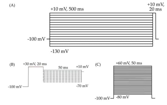 - Cummins, T.R.; Xia, Y.; Haddad, G.G. Functional properties of rat and human neocortical voltage-sensitive sodium currents. J. Neurophysiol. 1994, 71, 1052–1064. [Google Scholar] [CrossRef]
