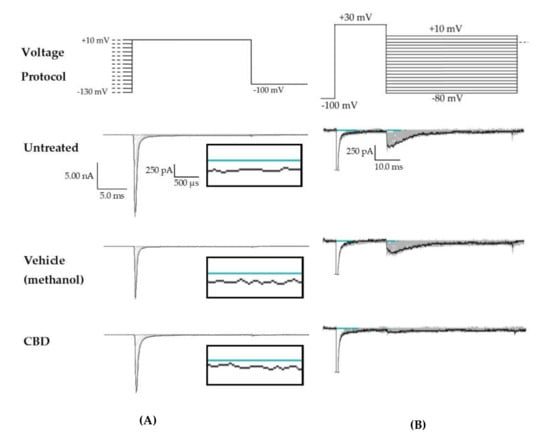 - Patel, R.R.; Barbosa, C.; Brustovetsky, T.; Brustovetsky, N.; Cummins, T.R. Aberrant epilepsy-associated mutant Nav1.6 sodium channel activity can be targeted with cannabidiol. Brain 2016, 139, 2164–2181. [Google Scholar] [CrossRef] [PubMed]