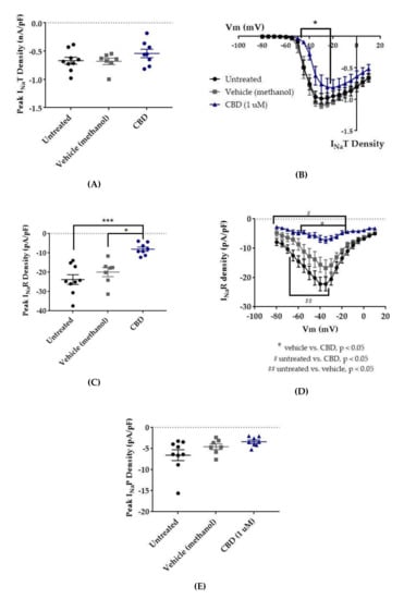 - Ghovanloo, M.R.; Shuart, N.G.; Mezeyova, J.; Dean, R.A.; Ruben, P.C.; Goodchild, S.J. Inhibitory effects of cannabidiol on voltage-dependent sodium currents. J. Biol. Chem. 2018. [Google Scholar] [CrossRef]