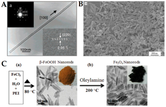 (A) TEM image of a Fe3O4 nanotube. Upper inset: Selected area electron diffraction of the nanotube. Lower inset: HRTEM image taken on the tube wall. Reproduced from [85] with permission from American Chemical Society, 2020. (B) SEM image of magnetite nanorods described in [71]. Reproduced from [71] with permission from Elsevier, 2020. (C) Scheme of the two-step synthesis of magnetite nanorods. Adapted from [88] with permission from Royal Society of Chemistry, 2020.