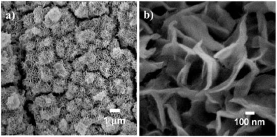 SEM image at different magnifications of magnetite nanosheets. Adapted from [100] with permission from American Chemical Society, 2020.