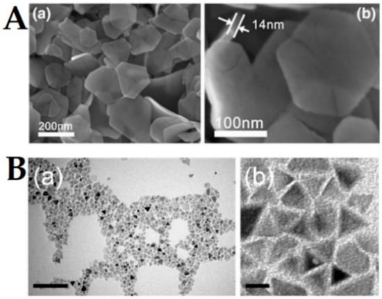 (A) SEM images of hexagonal-shaped magnetite nanoplates at different magnifications. Reproduced from [109] published in Open Access by Springer. (B) TEM images of triangle-shaped magnetite ultra-thin nanoplates at different magnifications. Adapted from [110] with permission from Royal Society of Chemistry, 2020.
