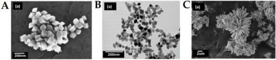 (A) SEM image of distorted cubes. (B) TEM image of nanocubes. (C) SEM image of self-oriented flowers. Reproduced from [115] with permission from Springer Nature, 2020.