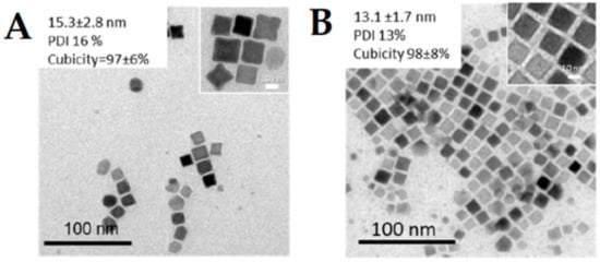 TEM image of (A) CoFe2O4 and (B) MnFe2O4 nanocubes. Adapted from [126] with permission from American Chemical Society 2020.