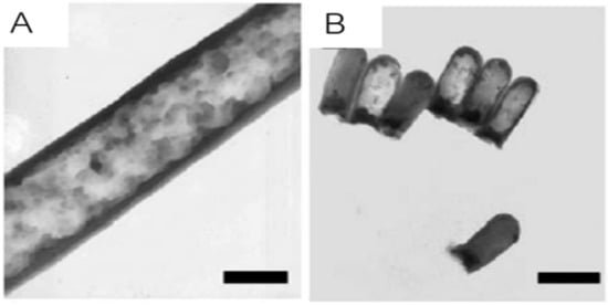 TEM images of 200 nm (A) and 60 nm (B) nanotubes with magnetite. Scale bars, 200 nm. Adapted from [147] with permission from Elsevier, 2020.