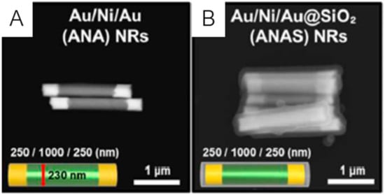 FE-SEM images of Au/Ni/Au nanorods (A) and silica-coated Au/Ni/Au nanorods (B) and respective schematic representations. Adapted from [65] with permission from Royal Society of Chemistry, 2020.