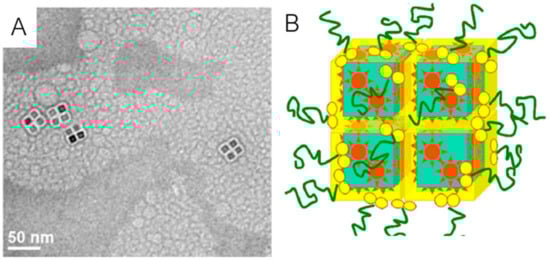TEM image (A) and schematic representation (B) of Rubik-like paclitaxel-loaded magnetic nanoassemblies. Adapted from [151] with permission from Elsevier, 2020.